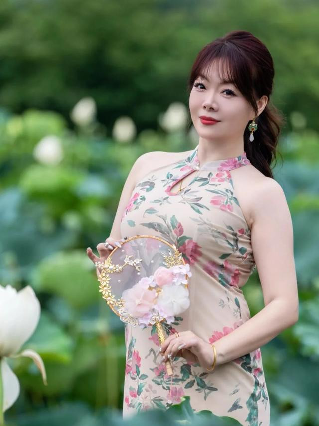越简单的动作越耐看。旗袍搭配荷花拍照时,双手轻捏扇子自然放在腹部前方,身子放松,面对镜头淡淡一笑,不需要复杂的表情和动作,就能把旗袍的温婉气质展现出来。这种构图也特别适合正面半身照。