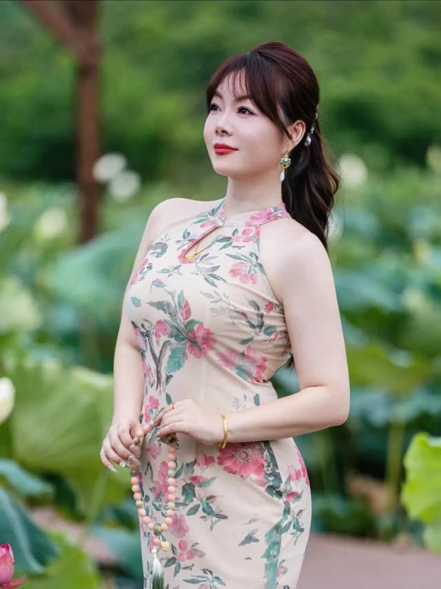 想拍出温柔安静的旗袍照,可以坐在荷花边低处,身体侧着,脸转向荷花方向。整个动作不要太刻意,嘴角带点微笑,看着别的方向更自然。这种姿势很适合拍侧脸,旗袍的轮廓也会更清晰,特别显身材。